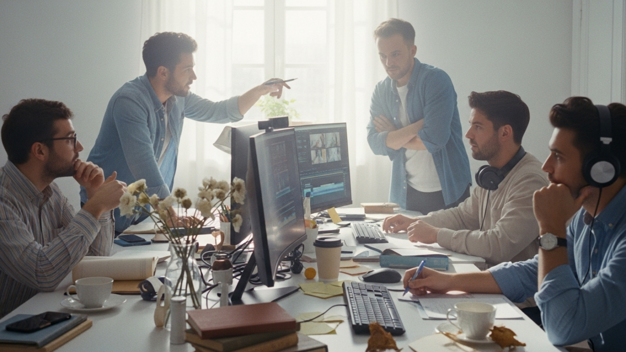 Creative team collaborating on video edits in an office, reviewing project timelines on multiple screens and discussing revision feedback.